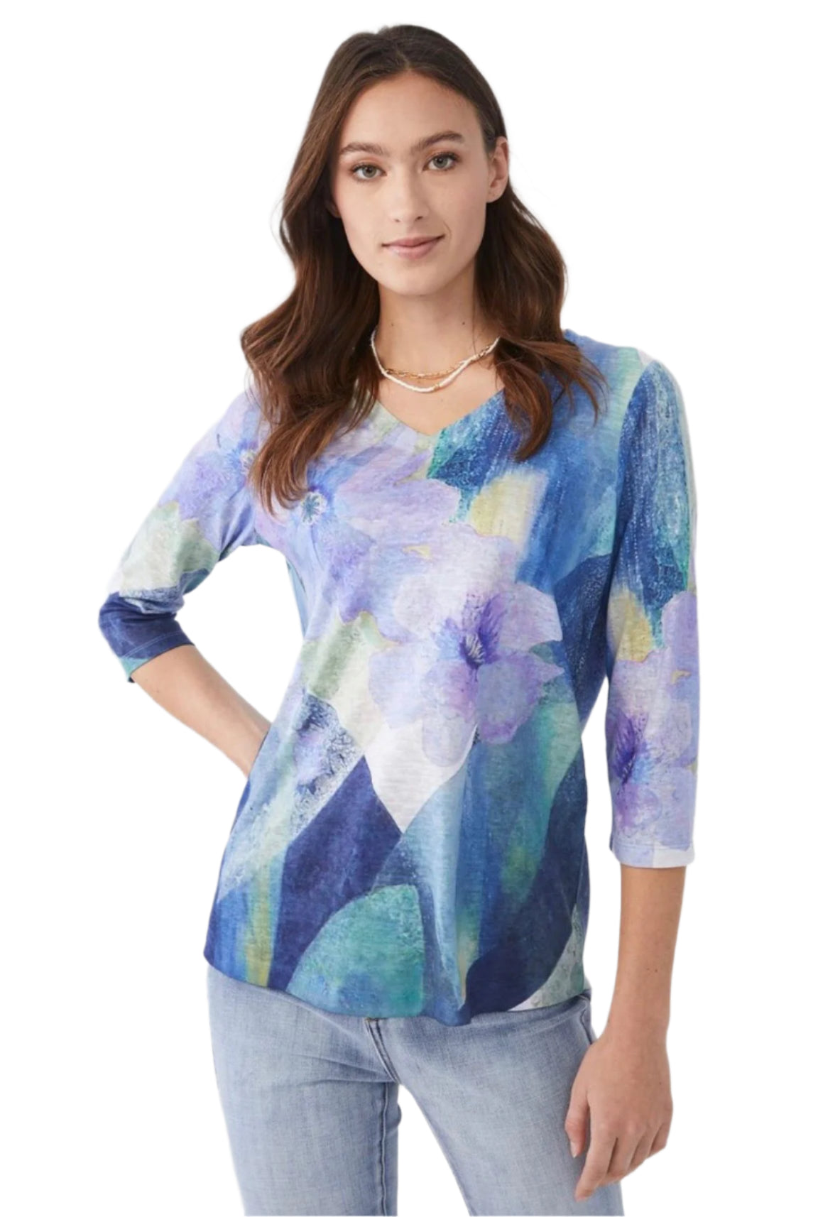 Get ready to add some flower power to your wardrobe with this FDJ top! This top features a unique botanical layer print, V-Neck, and 3/4 sleeves - perfect for adding a touch of playful charm to any outfit. Comfort and style come together seamlessly in this must-have piece.